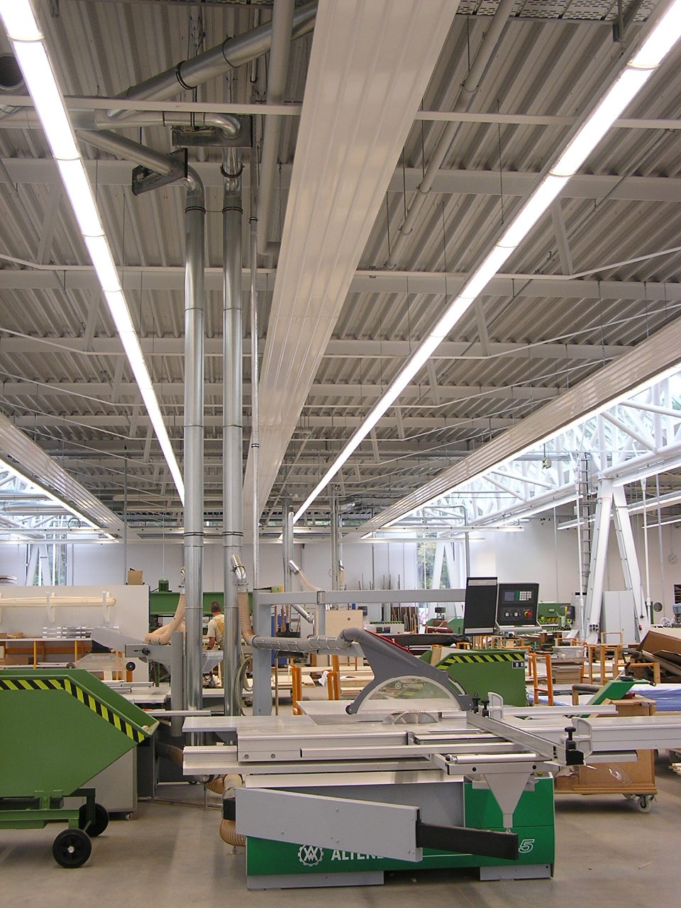 - Raumlufttechnische Anlagen mit einer Luftleistung von insgesamt 50.000 m³/h für Produktion, Teilklimatisierung Büro und Klimatechnik im Furnierholzbereich. Konsequenter Einsatz Wärmerückgewinnung auch im Produktionsbereich